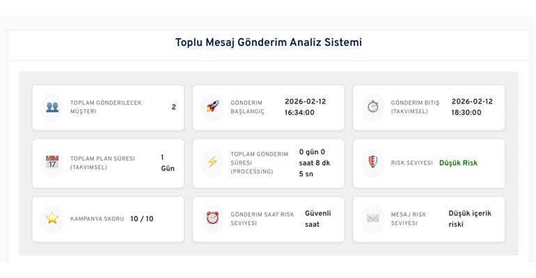 Mesajınız ne kadar etkileyici? Sistemimiz, mesajınızı göndermeden önce akıllı bir algoritma ile test eder. İçerikteki kelimelerden, link yapısına kadar her şeyi 100 üzerinden puanlar. Kritik bir hata veya spam riski bulursa sizi uyarır ve mesajınızı nasıl iyileştireceğinize dair net yönlendirmeler yapar.
